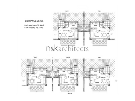 Complex of 5 identical villas with 3 bedrooms, 3 bathrooms, private pools, storage and parking areas.